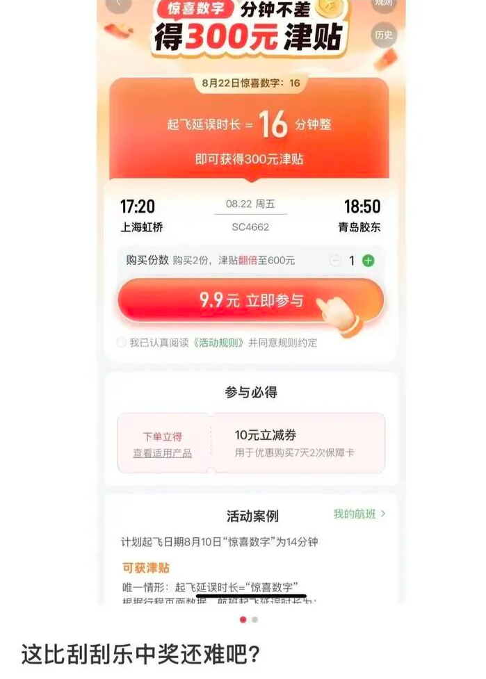 计划起飞日期当天会显示一个特定数字,可获津贴的唯一情形为“起飞延误时长=惊喜数字”,9.9元即可参与该活动。