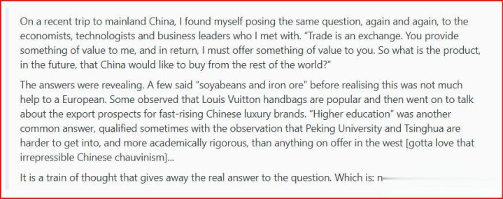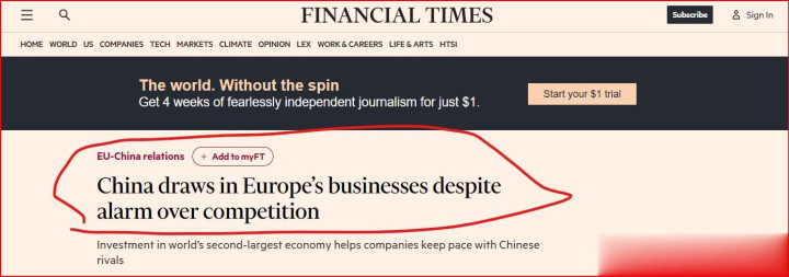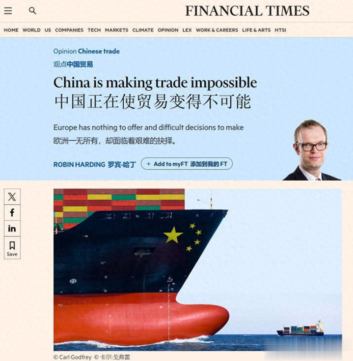 意思很明显:我们打不过,所以只好加入了。欧洲生产的东西,因为种种原因导致价格特别贵,在中国市场根本没有竞争力。前几天金融时报还发了另一篇文章《China is making trade impossible(翻译为:中国正在使贸易变得不可能)》,表示中国对外采购根本不需要工业品,他们只需要从国际贸易中获得原材料、粮食、能源,并且向全世界出口除了粮食、能源之外的任何东西。