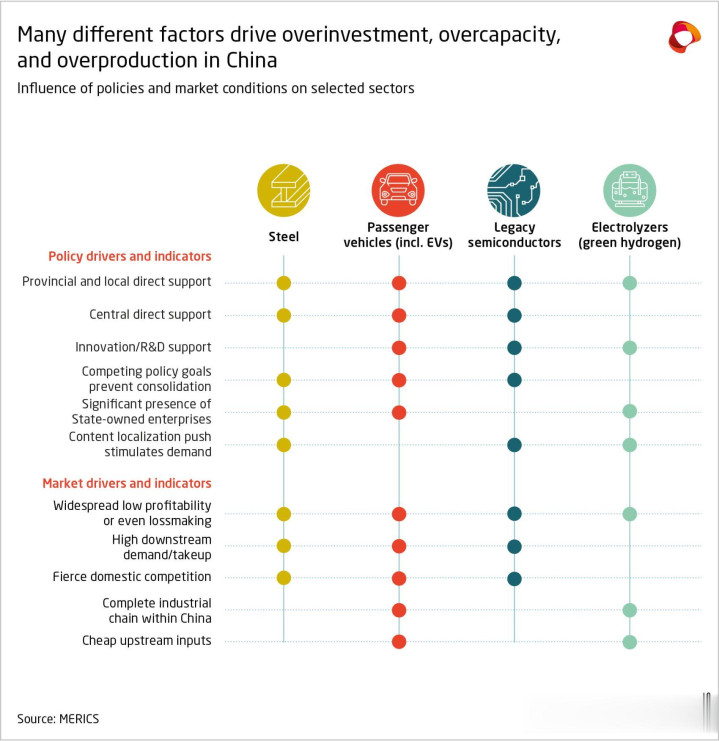 那么,为什么欧洲的制造业无法跟中国匹敌呢?他们可是曾经是全世界的制造中心之一啊,欧洲产业研究中心的MERICS,曾经专门对欧洲的产业进行了一系列的分析,上图就是他们的研究结论了:如果不想办法自救,短期内欧洲的半导体、中低端工业机械和零部件、IT设备、中低端医疗设备都会崩,接下来就是高端产品也会随之而崩。
